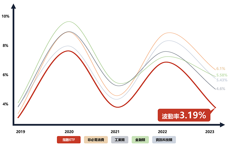 2019.05-2023.09 指數ETF與類股指數年波動率比較,資料來源:TradingView